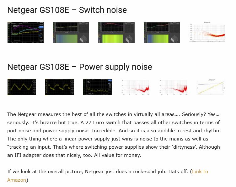 睇返 Alpha-Audio 其他測試及網上嘅評論,首先有 PoE 嘅 switch 都幾乎一定會衰聲,因為 PoE 模組會帶來嚴重干擾,令 switching noise 大增。第二係低級啲嘅 GS108 及高級啲嘅 GS108T 都冇 GS108E 咁好聲,因為 GS108E 用嘅網絡隔離模組係全金屬,GS108 係膠,而 GS108T 就有 PoE 供電輸入。五個 port 嘅 GS105E 同八個 port 嘅 GS108E 音質上無異,但由於 GS108E 不論全新及二手都比較易搵,所以都係建議優先考慮 GS108E。